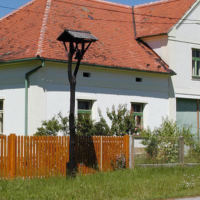 Stylová rozsochatá vidlice se zvonkem, dřevěnou stříškou a ručním táhlem zdobí náves.