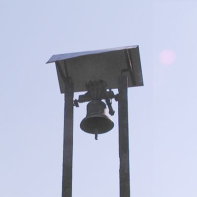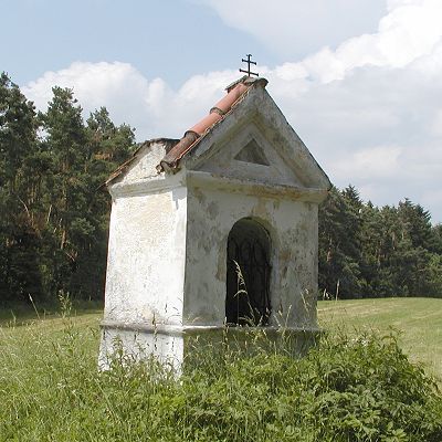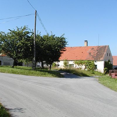 Vesnička mimo hlavní trasy se zvoničkou a zemědělskými usedlostmi.